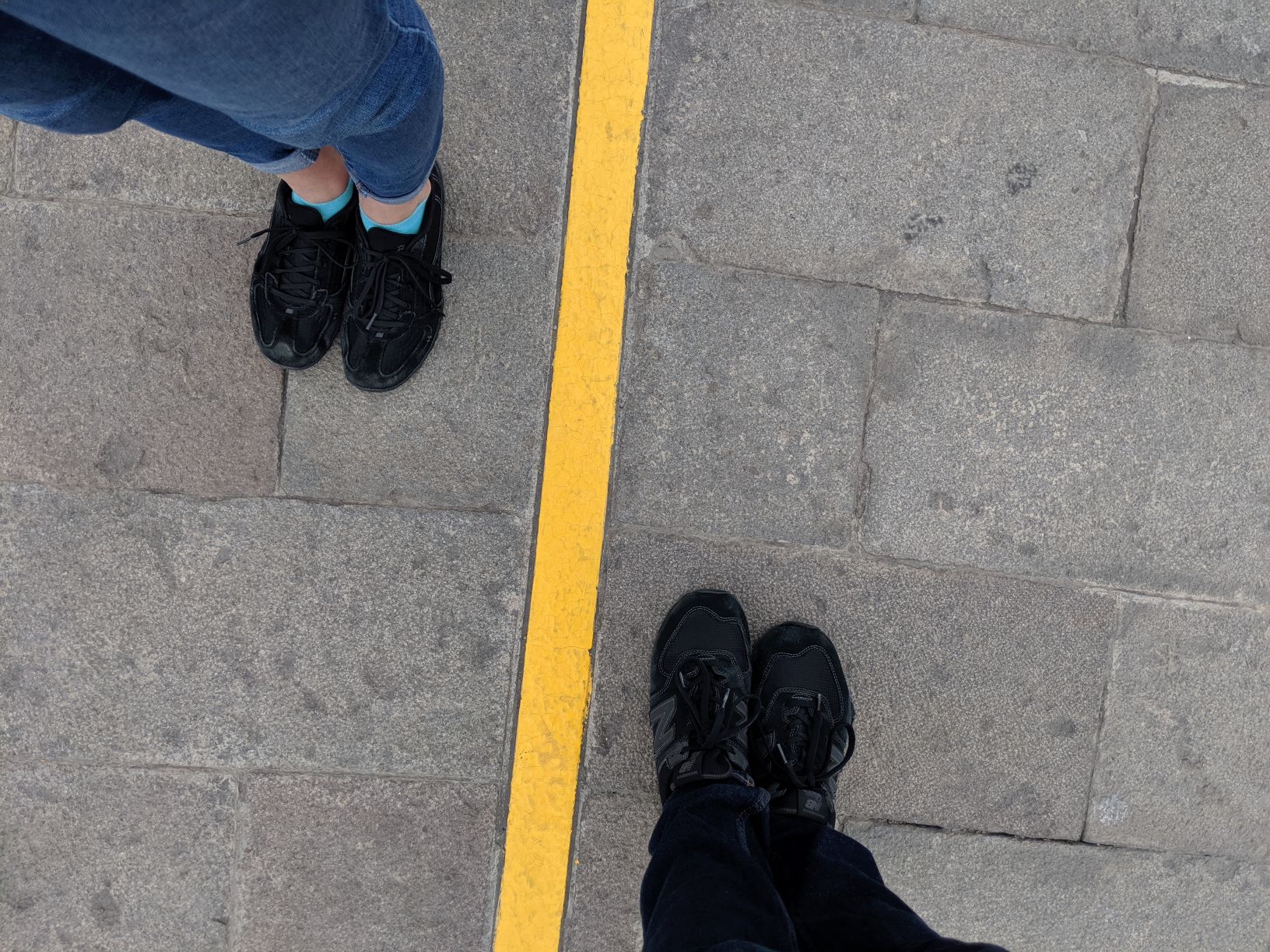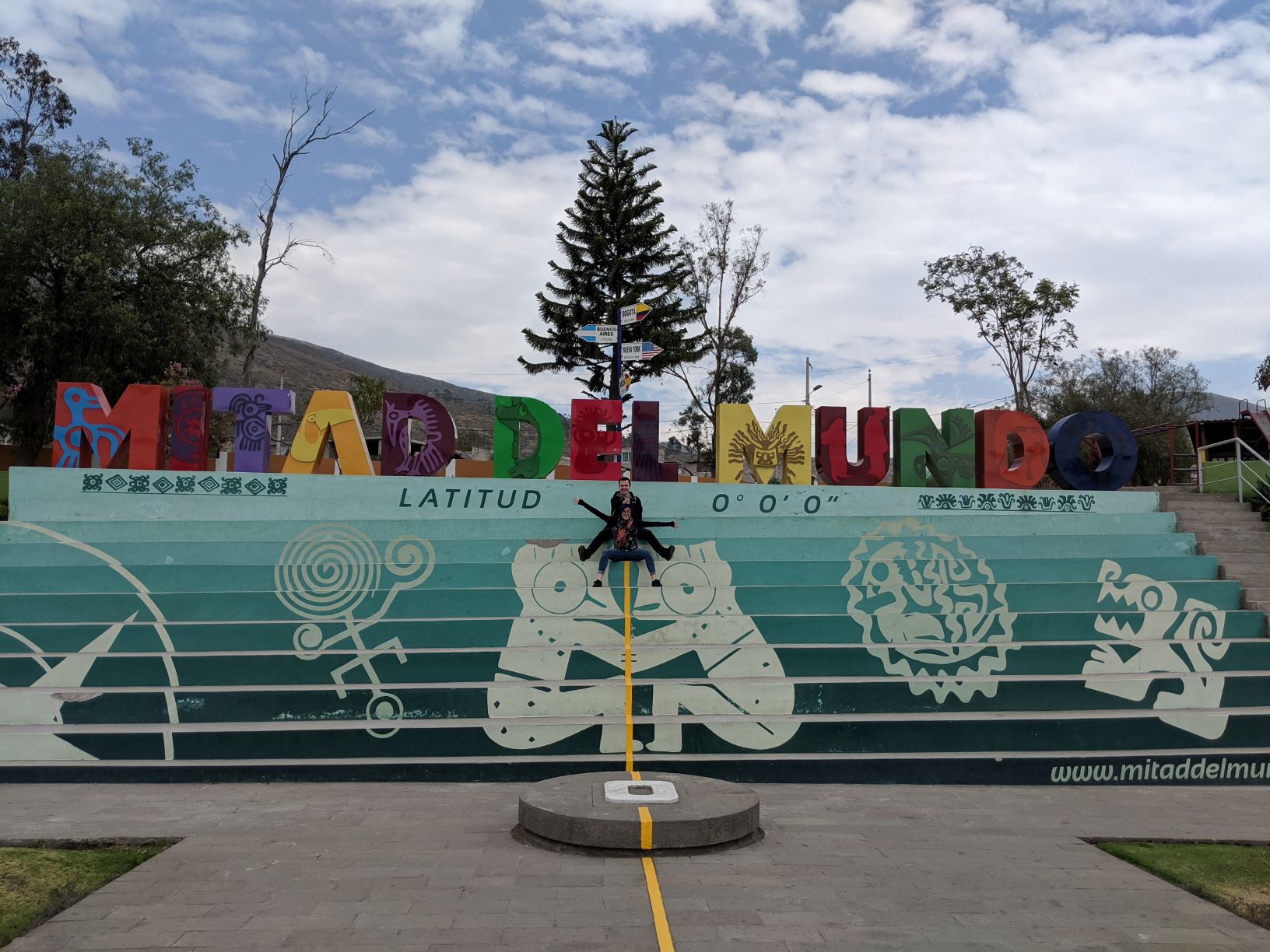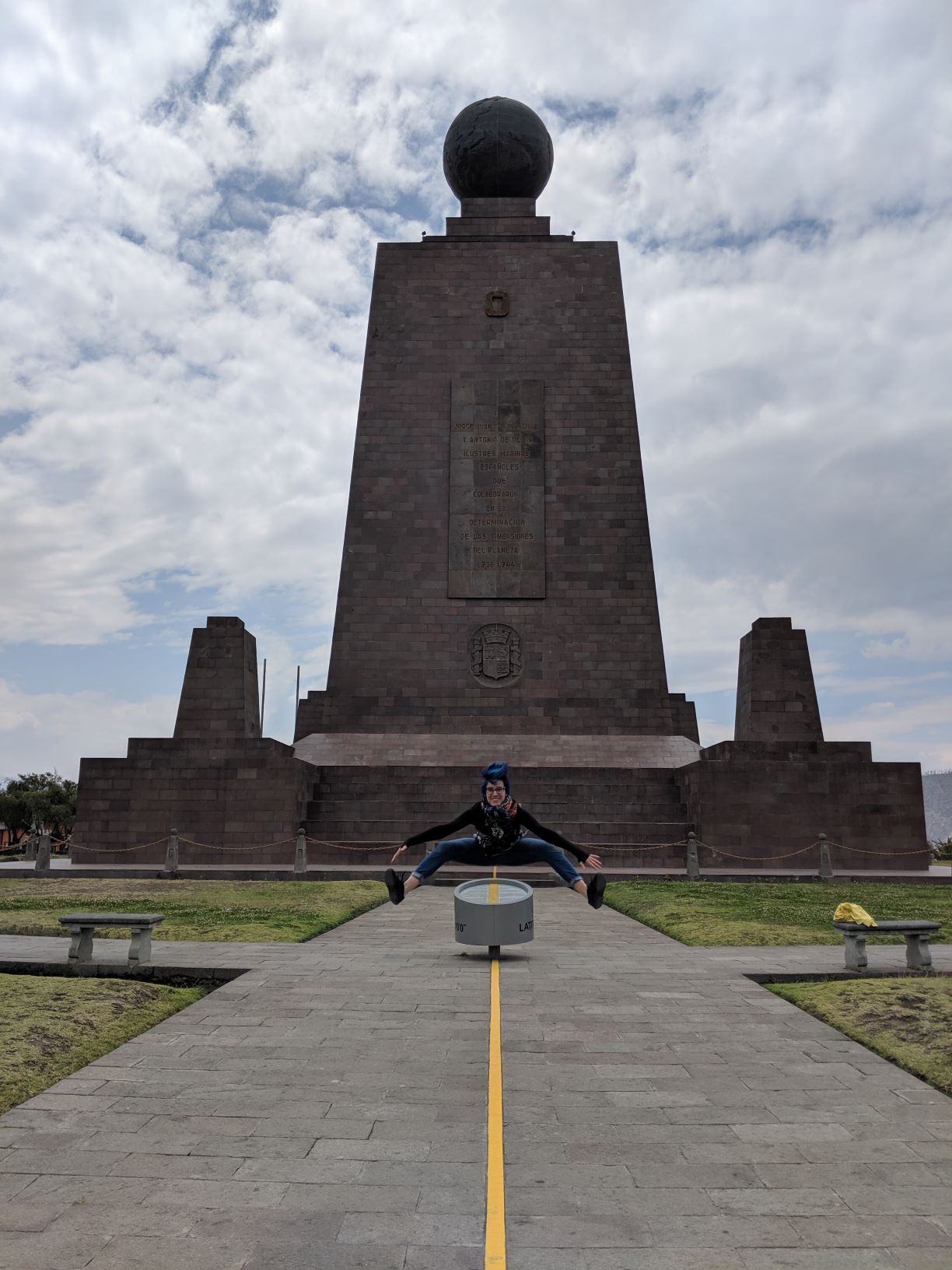 Did we mention Quito is full of topography? Also, geography! We visited the Mitad del Mundo (“middle of the world”) site, which is along the equatorial plane, though not on the actual precise 0.000, 0.000 equator itself. The Mitad del Mundo was built so tourists could take goofy photos with one foot in each hemisphere, as follows: