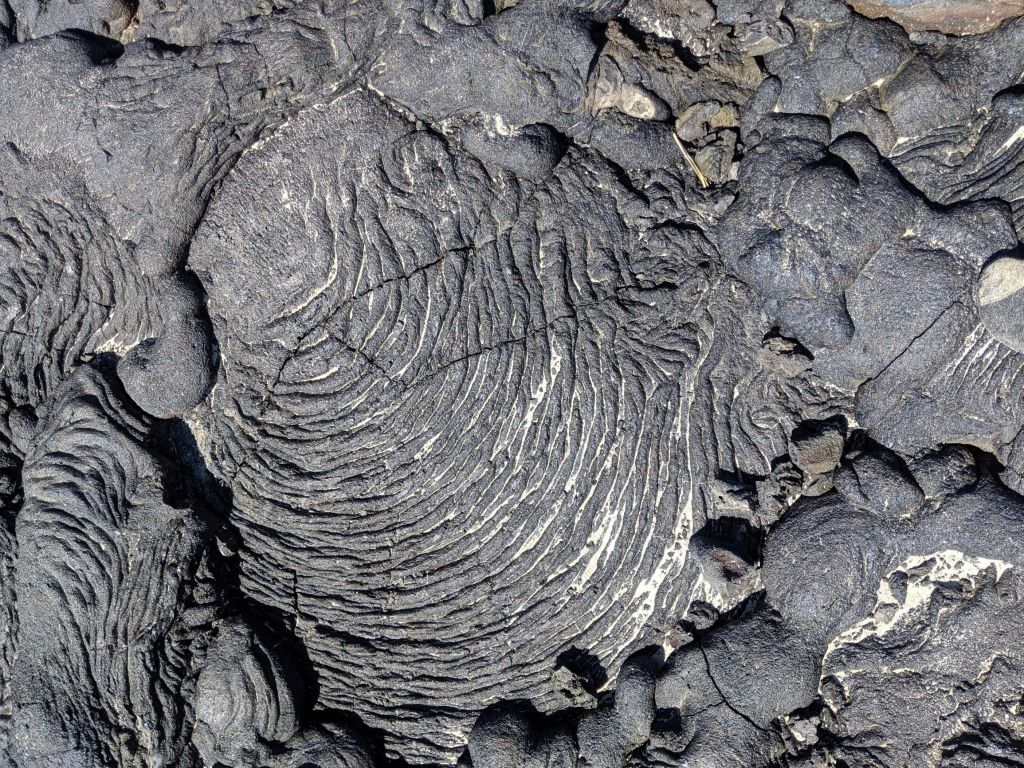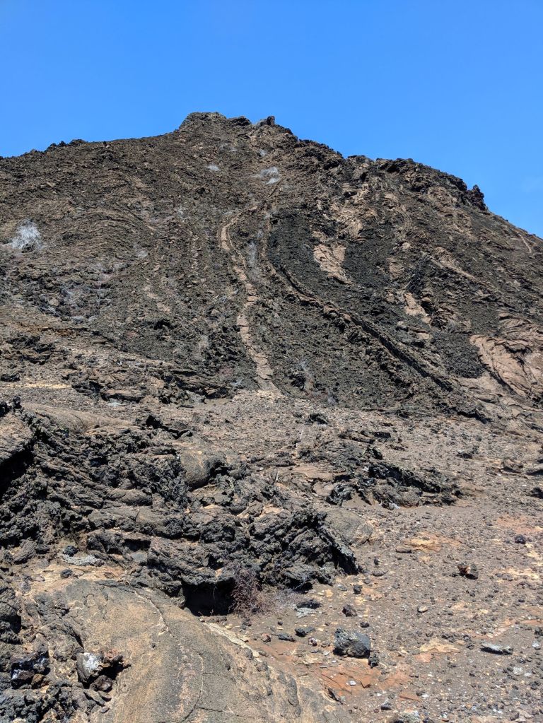 On Bartolome, we saw two types of basaltic lava, pahoehoe and a’a. These Hawaiian words for lava types have been adopted by geologists worldwide. Pahoehoe lava flows slowly, has a smooth, ropy texture, and typically forms thin layers between 20cm and 2m. A’a lava typically moves quickly, has rough, jagged and broken surfaces, and has thicker flows, from 2m to 10m in height.