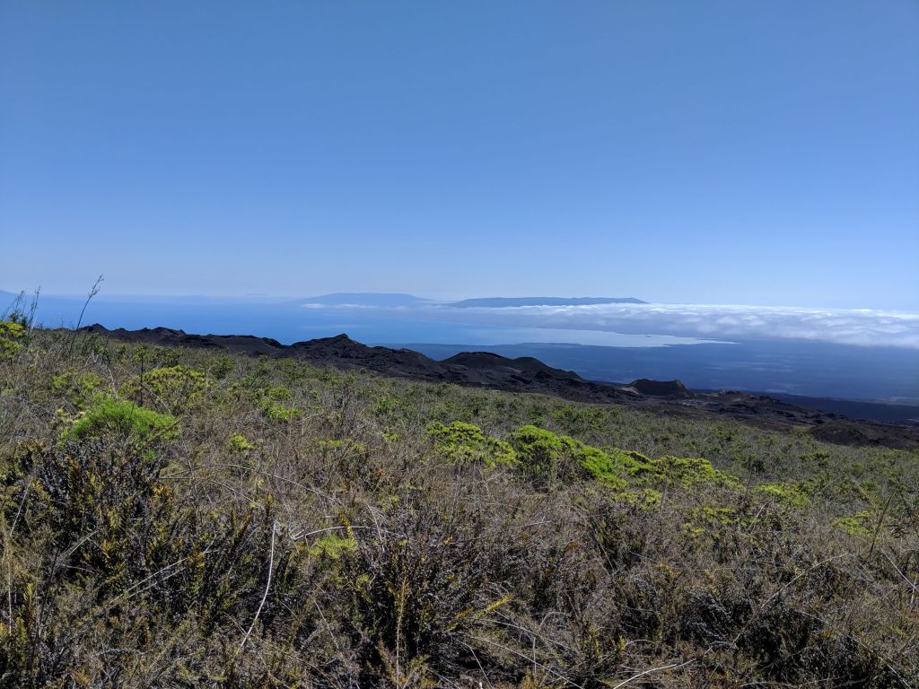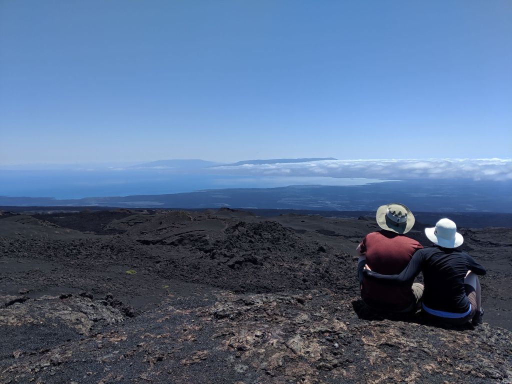 We climbed one of the six volcanoes that make up Isla Isabela (Sierra Negra) on a long, dusty day hike that brought us to the rim of the caldera, and to the lava flows from eruptions in 2018, 2005, and 1950. The caldera is about 45 km in circumference and the scale is just mind-boggling. Remember – this is one of six that make up this island! From the 1200m summit, we could see the other five volcanoes peeking up above the clouds. If you look carefully in the photos and video below you should be able to spot a few of them.